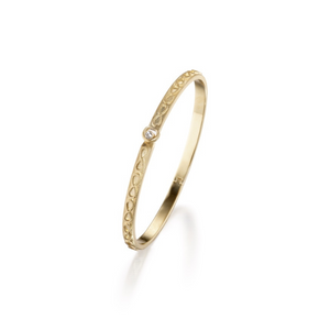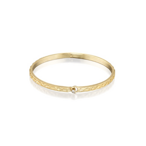 Part of Elizabeth's Infinity Collection, this oval bangle is made of 14K recycled gold, subtle Infinity sings and adorned with a delicate diamond clasp. Fits average size wrist.