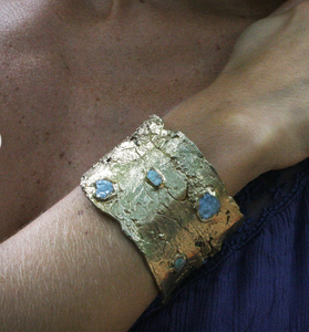 Inspired by birch bark found in Vermont, this brass statement cuff is embedded with aquamarine and emerald. This bracelet is slightly adjustable by gently squeezing the metal.