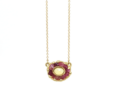 Inspired from the idea of seeking the strange and mysterious out of life through the looking glass; A rose cut Ethiopian opal is surrounded by a halo of pink sapphires and embedded in 14k yellow gold and anchored on solid gold cable chain secured by a lobster clasp.