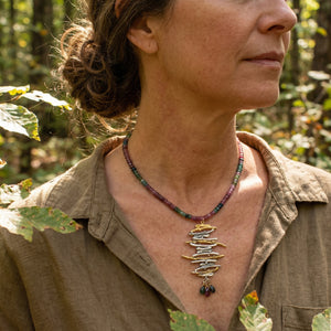 The pendant’s layered elements form a rhythmic, branch-like design that feels both natural and architectural. Suspended below, small faceted gemstones add a subtle touch of color and movement, echoing the palette of the hand-strung tourmaline bead necklace.