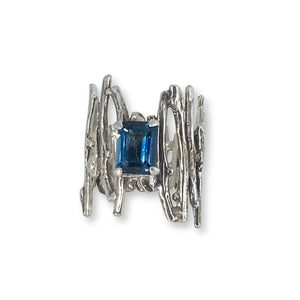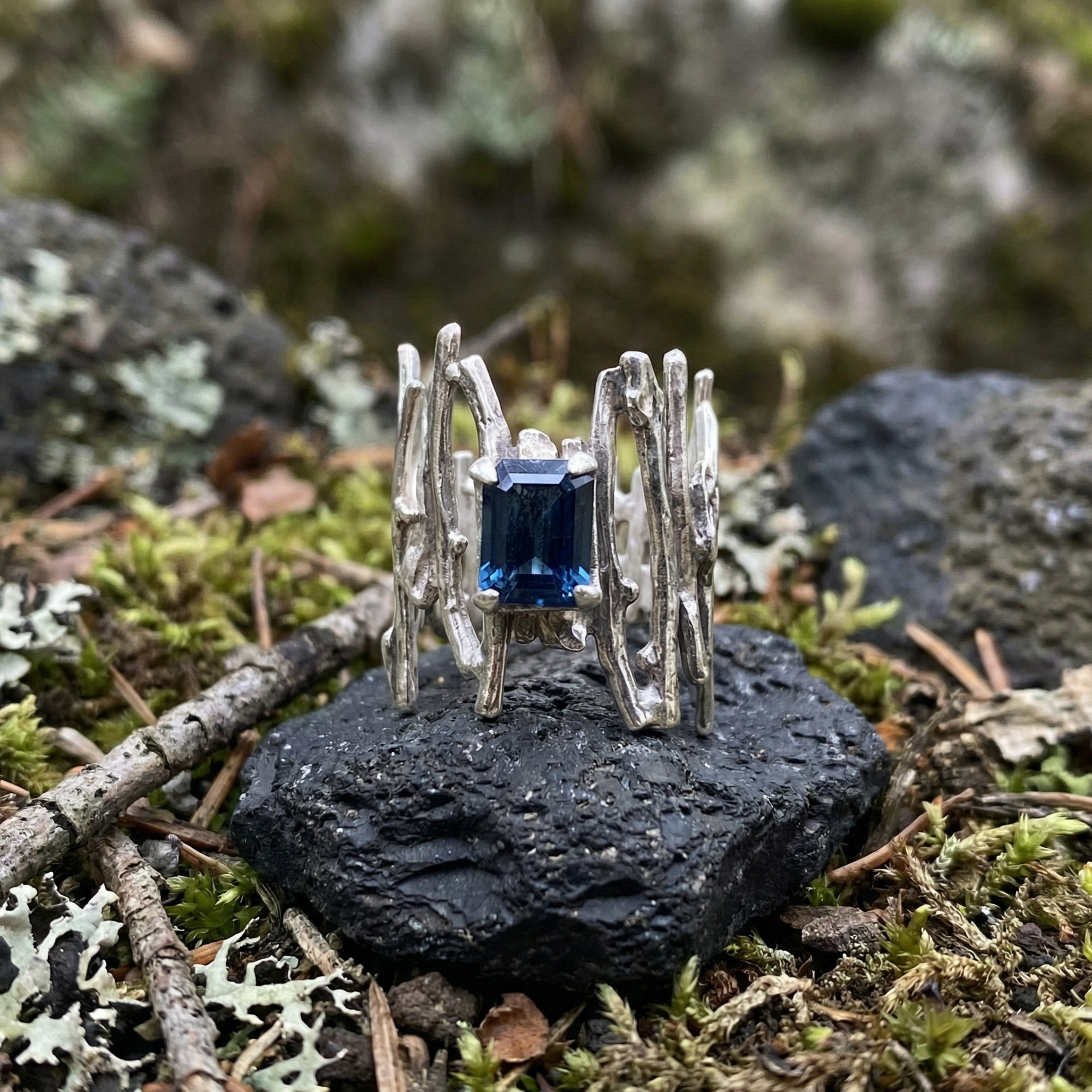 Slip on the Woodland Ring and carry a piece of the forest with you. Sterling silver branches wrap together to form the shank, creating an organic, sculptural setting that feels both wild and refined. At the center, a faceted emerald-cut London Blue Topaz glows with deep, mysterious color—like a hidden pool of water reflecting the forest sky.