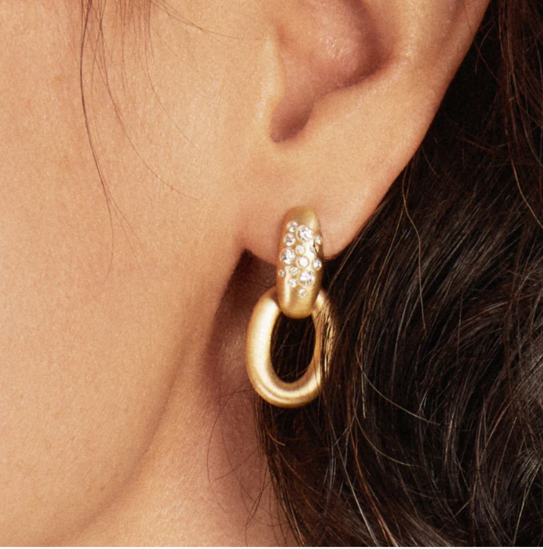 The Diamond Knocker Earrings from our Fairy Dust Collection are a bold yet sophisticated statement. Crafted from 18K recycled gold, these earrings feature a diamond-studded hoop that interlocks with a sleek gold hoop, offering versatile dual-wearing options.