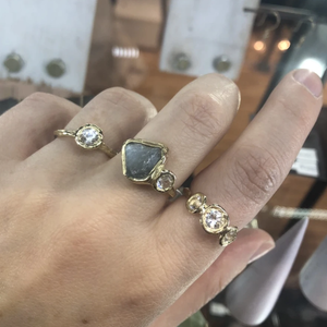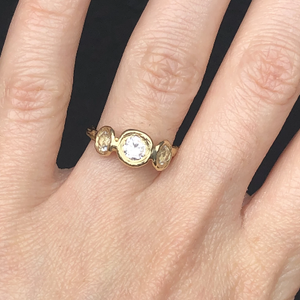 Inspired by the warm rays of a sunburst spreading their light and giving life. Two 4mm faceted white sapphires frame one central 5mm faceted sapphire set in recycled 14K yellow gold. This ring truly radiates!
